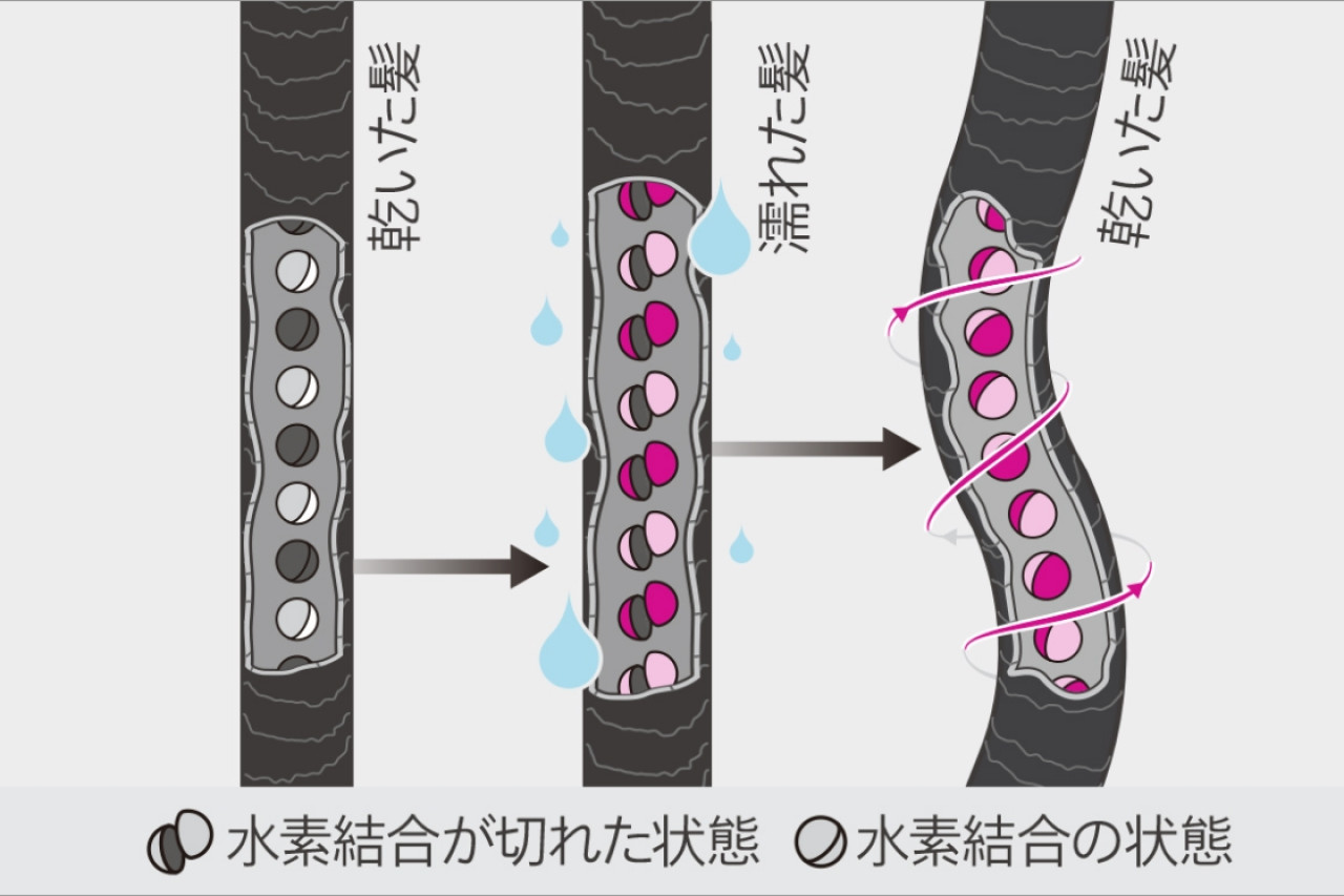 ダイソン エアラップは、濡れている髪の水素結合が切れている状態を利用し、コアンダ効果によって髪を乾かしながらスタイリングします。
