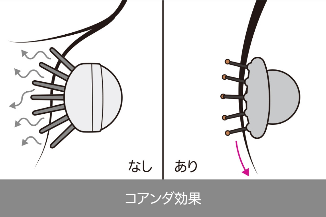 再設計されたカーラーは周囲に発生するコアンダ気流をさらに断続的に送りだし、髪を自動的に引き寄せてカールをつくります。