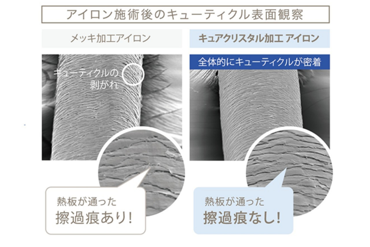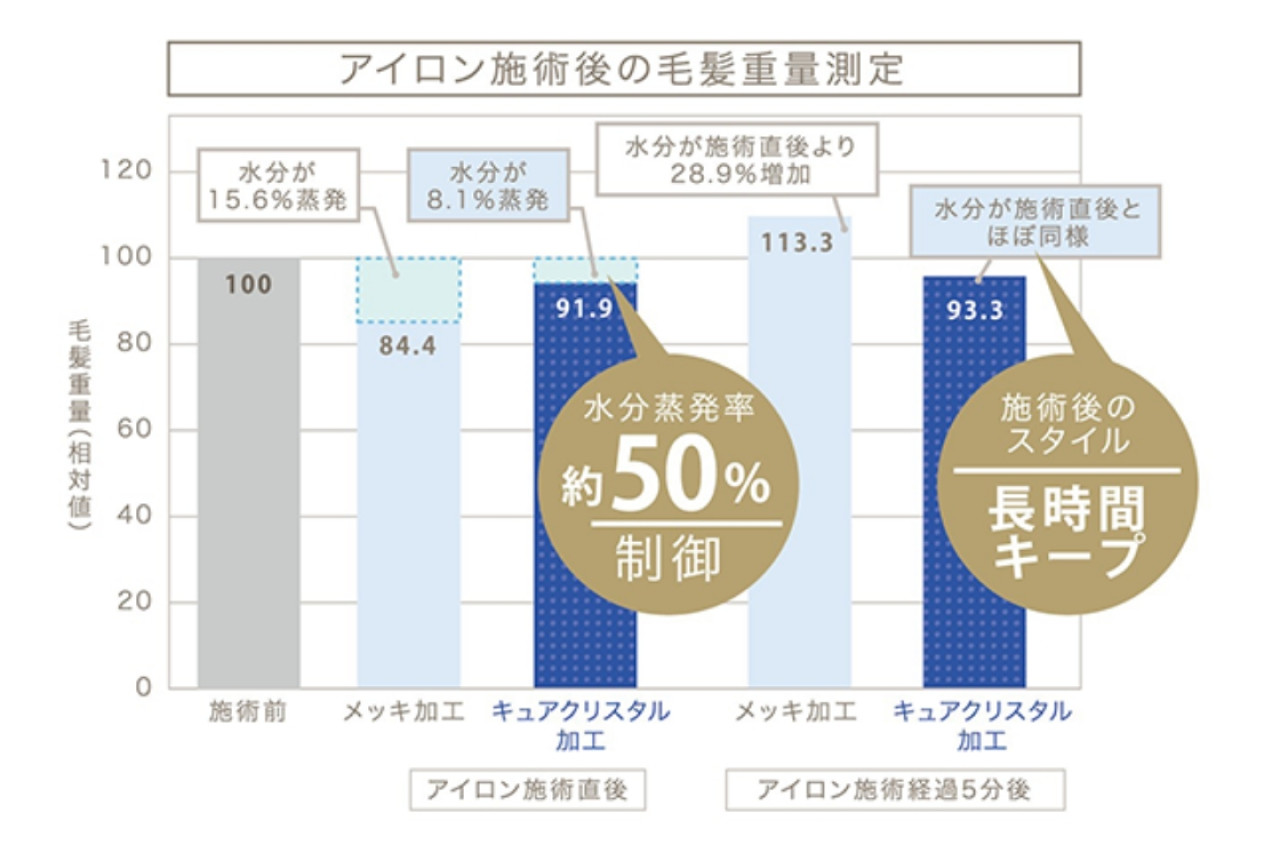 キュアスタイリングプレートの「育成光線(テラヘルツ波)」効果により、微細化(クラスター化)された水分が、毛髪内部のタンパク質に吸収され、結合水としてなじむことで「潤い」を保持。また、施術後のスタイルを長時間キープします。