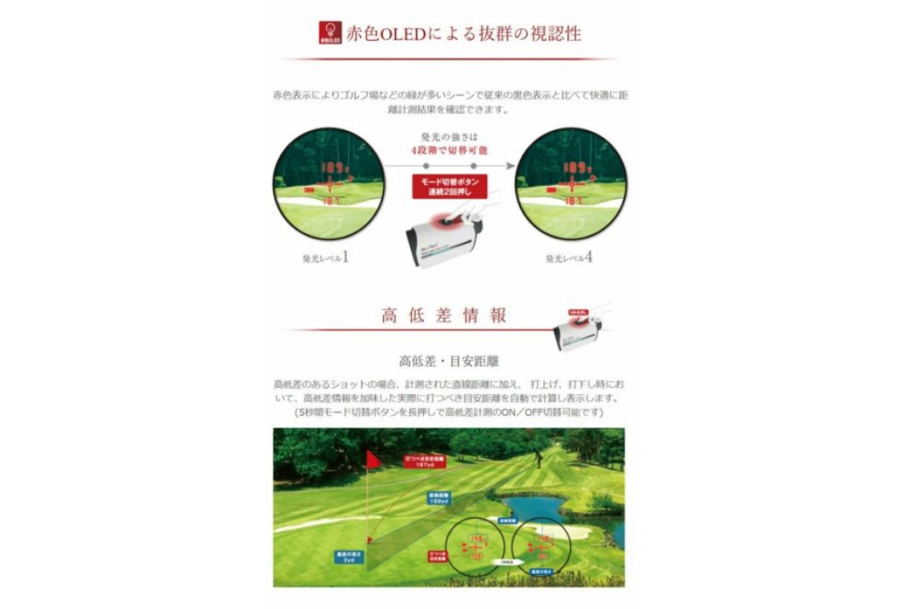 赤色表示によりゴルフ場などの緑が多いシーンで従来の黒色表示と比べて快適に距離計測結果を確認できます。