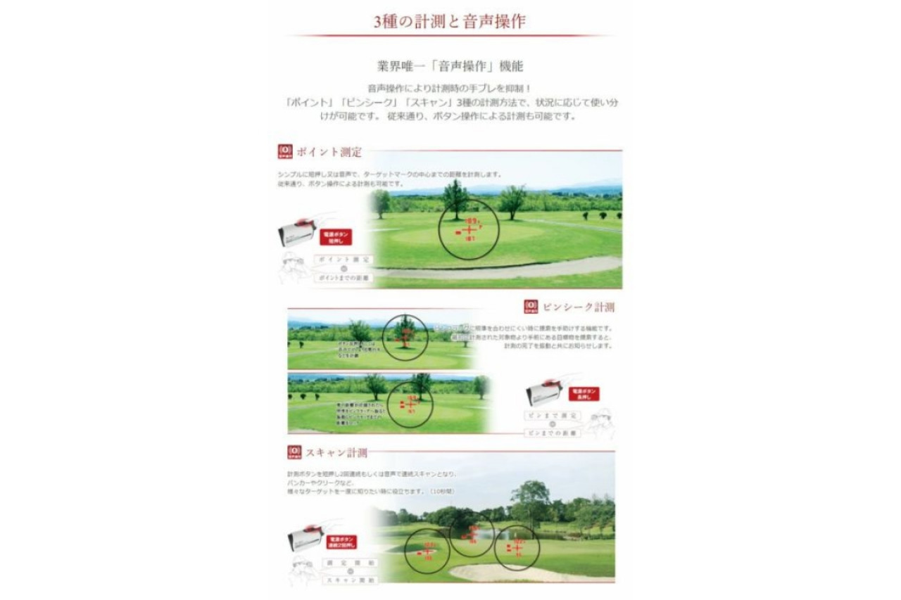 「ポイント」「ピンシーク」「スキャン」3種の計測方法で、状況に応じて使い分けが可能です。 従来通り、ボタン操作による計測も可能です。